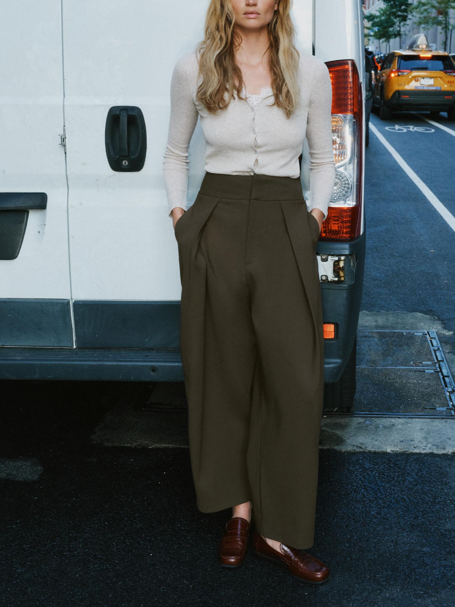 High-waist balloon trousers. Featuring front pleat details and a front zip, inside button and metal hook fastening.