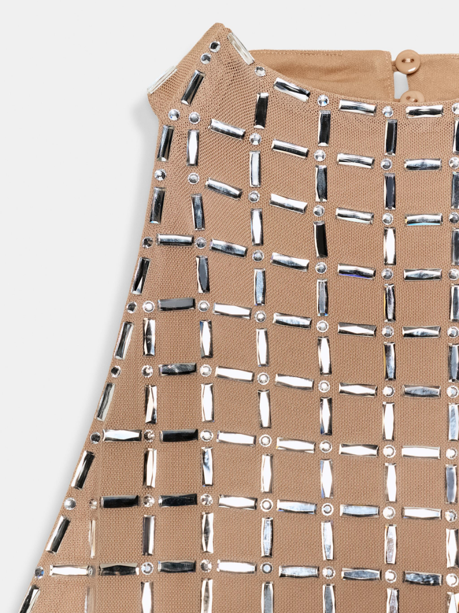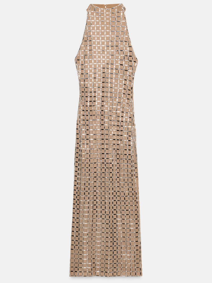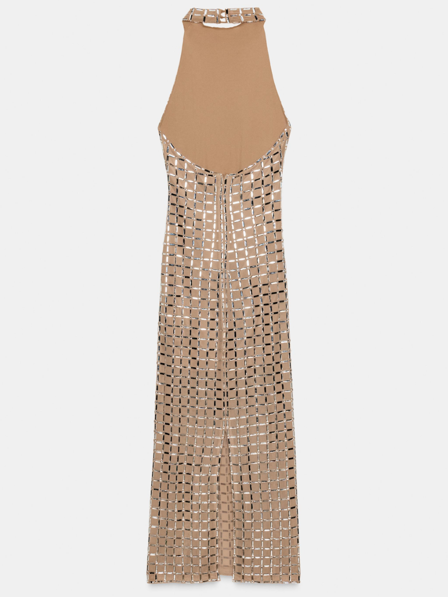 Midi dress made of mesh fabric. Adjustable halter neck with buttons and off-the-shoulder design. Combined sparkly appliqué detail in a contrasting color. Back zip closure and slit hem.