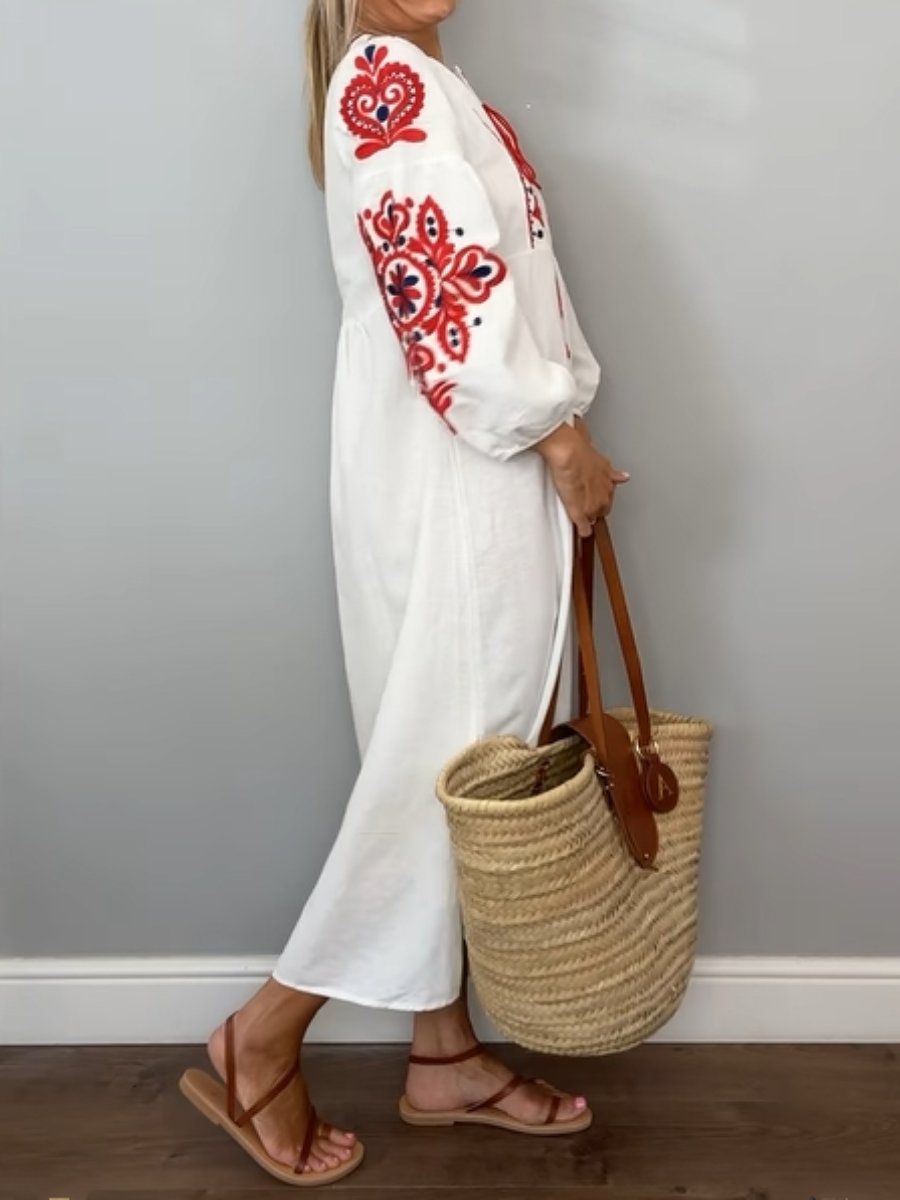 Embroidered Lace-up Lantern Sleeve Dress